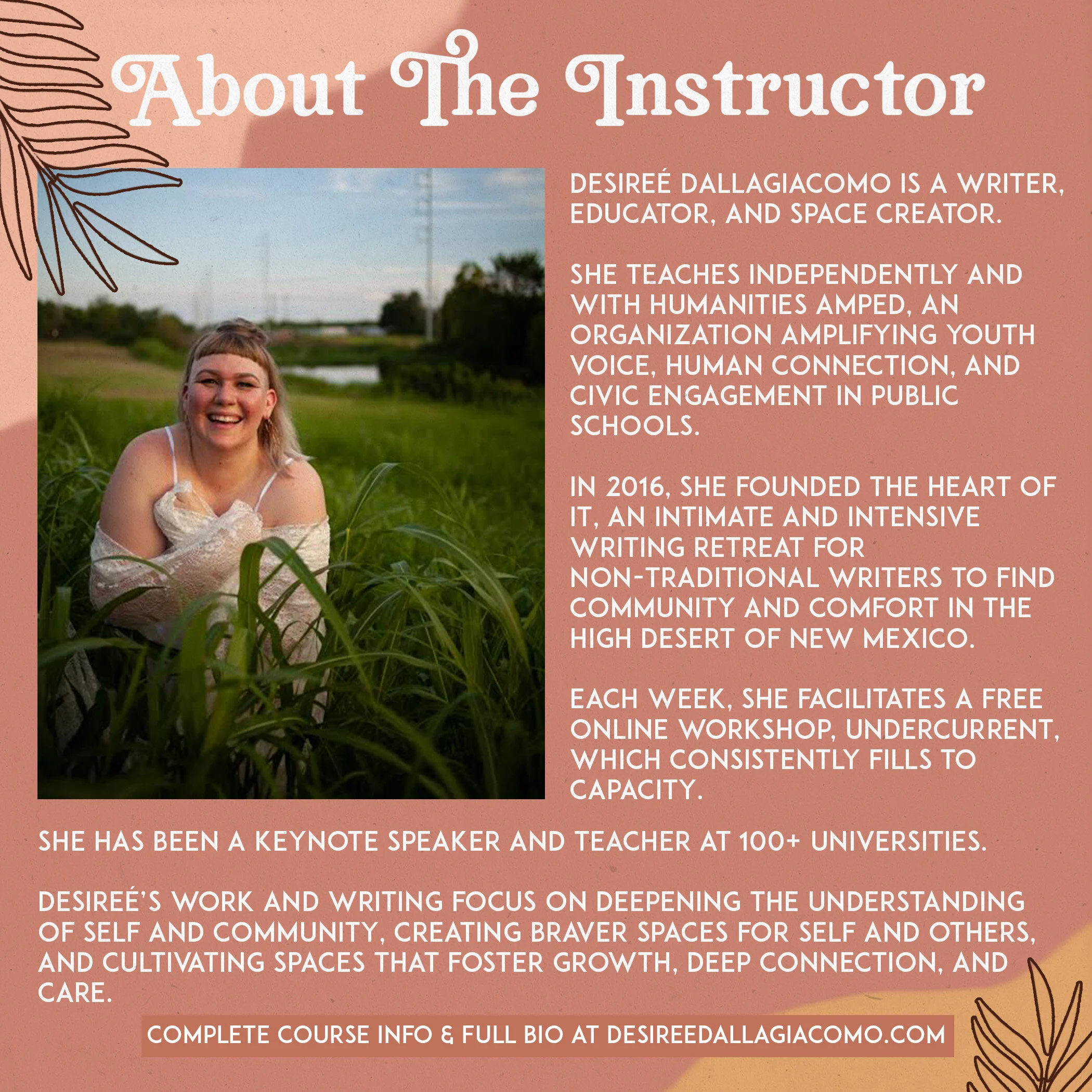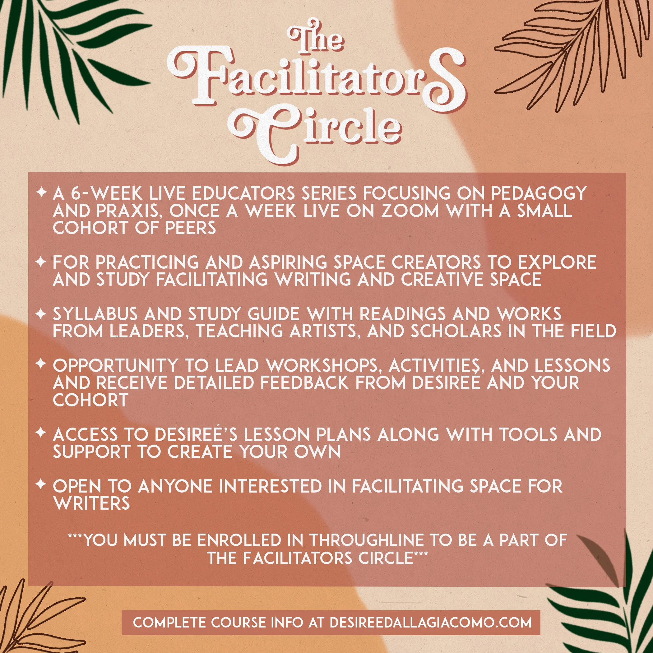 The Facilitators Circle: A live 6-week course for educators to explore teaching writing, holding creative space, and cultivating community with Desireé Dallagiacomo (you must be enrolled in Throughline to be apart of The Facilitators Circle).